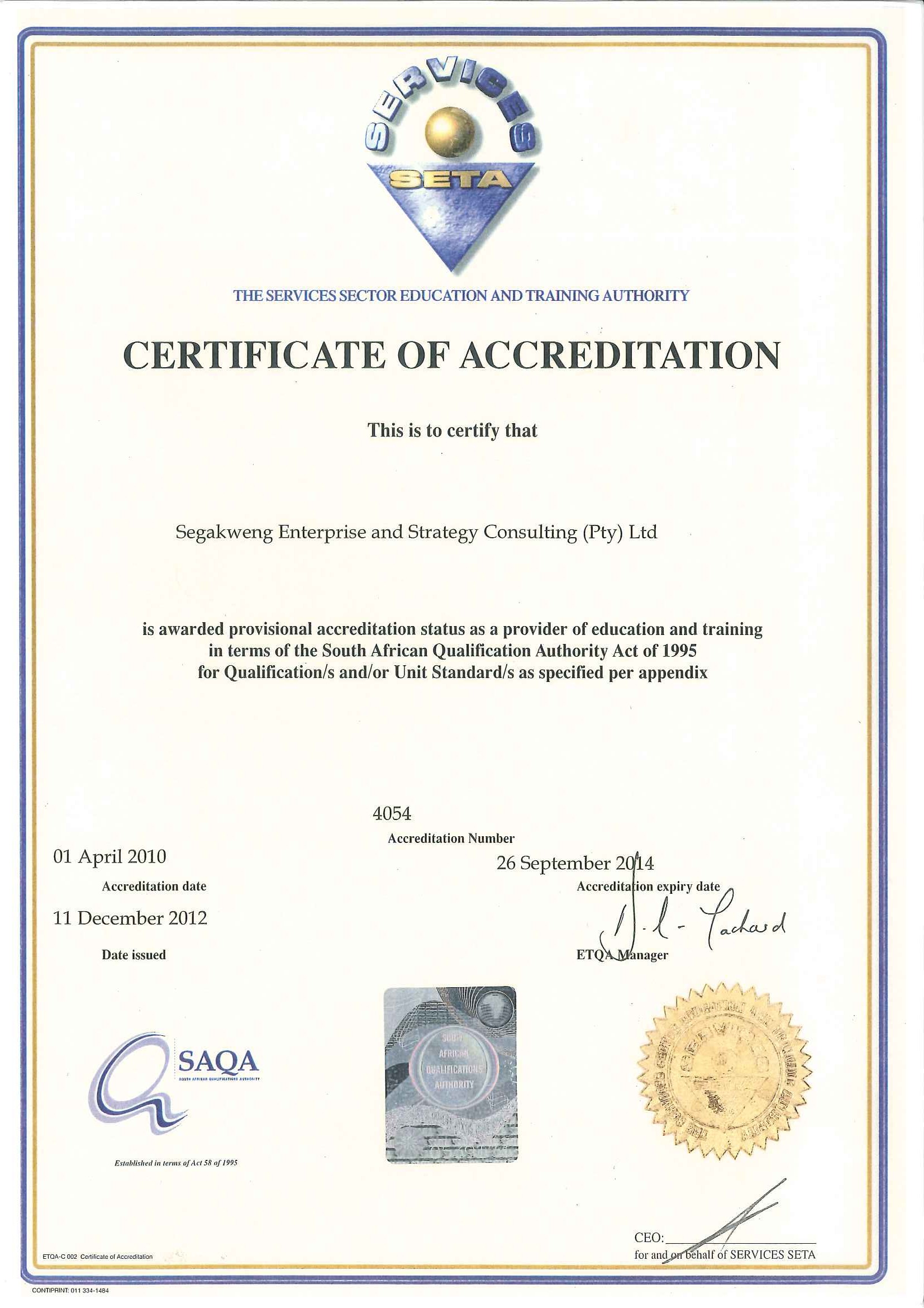 - SEAS is an accredited Business Skills Training entity through Services SETA – FETC: New Venture Creation: Accreditation no:- 4054